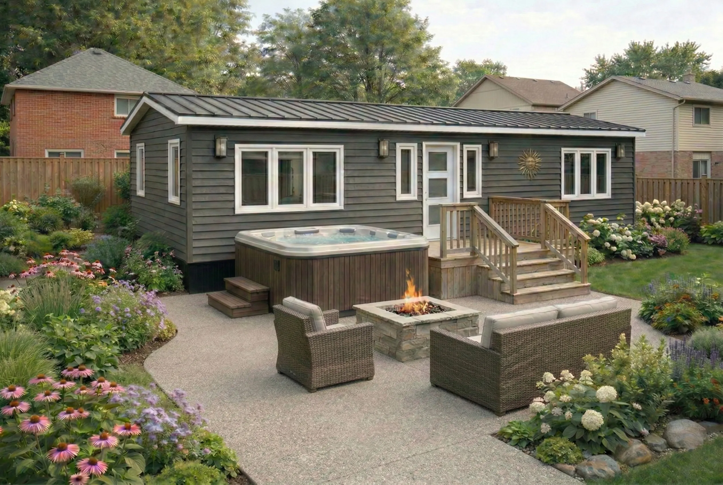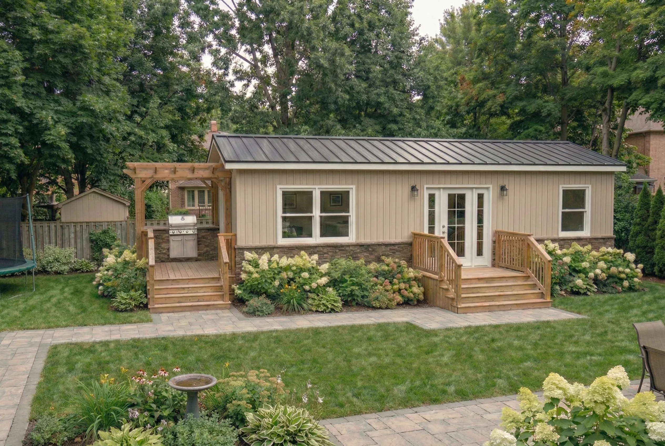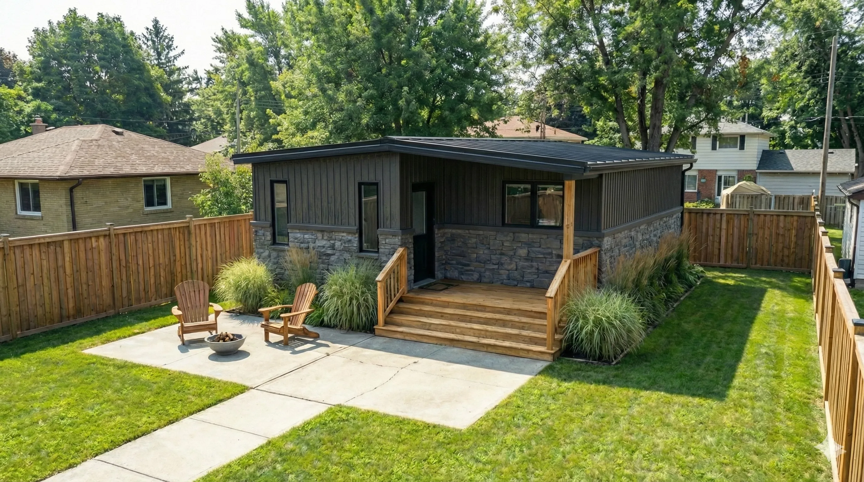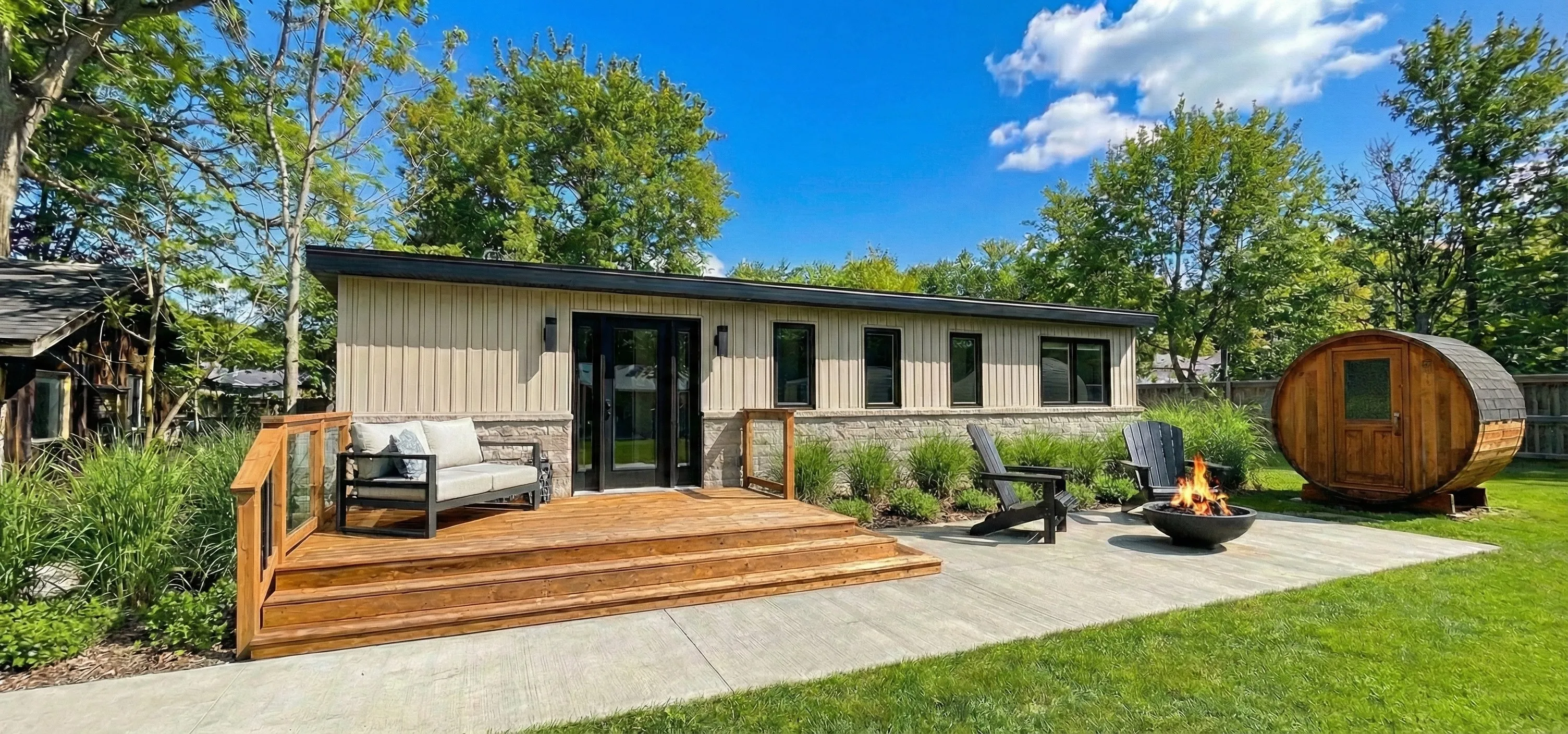 A fully finished, move‑in ready backyard recreational bunkie that fits most lots and budgets.